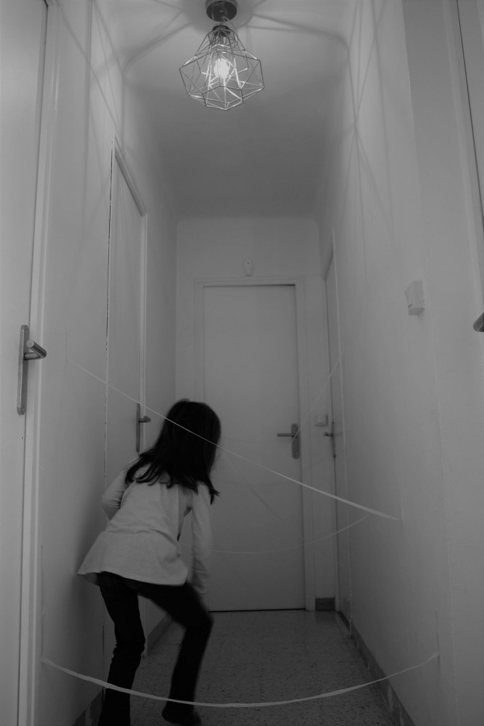 Si vous avez un couloir chez vous, du scotch de masquage et trois minutes de libre… proposez à vos enfants de tester leur souplesse et de jouer au cambrioleur d’œuvre d’art évitant les lasers d’un musée.