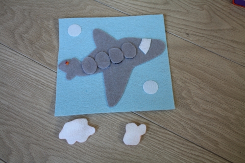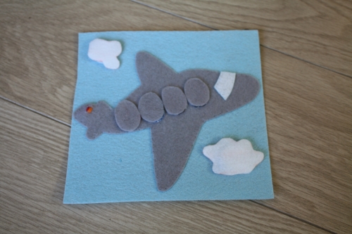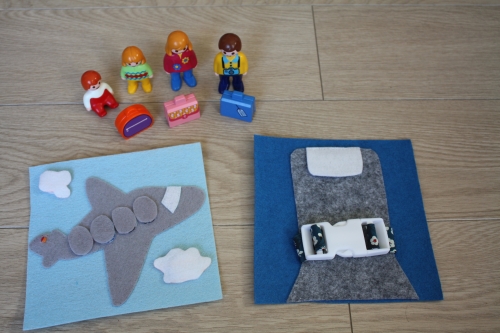Je cherchais des idées de jeux pour occuper les filles lors d’un long courrier, donc peu encombrants, légers et non bruyants. Et j’ai décidé de faire un quiet book (un livre en tissu avec des activités), enfin des pages, je verrais après le voyage comme les assembler ensemble. Voici donc les deux premières pages sur le thème de l’avion.