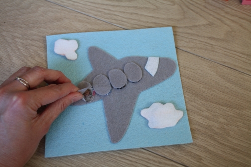 La première page devrait plaire à la cadette. Je suis partie d’un coloriage d’avion pour faire mon gabarit. J’ai découpé l’avion dans de la feutrine grise. J’ai juste fait quelques points au fil à broder sur la queue de l’avion. Derrière chaque hublot fermé, j’ai caché une photo de chaque membre de la famille. Pour éviter que le papier ne n’abime, j’ai ajouté par dessus un morceau de pochette plastique et j’ai cousu au fil nylon transparent. Et enfin, j’ai découpé deux nuages qu’elle pourra décrocher et raccrocher grâce aux scratchs.