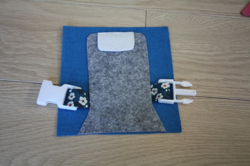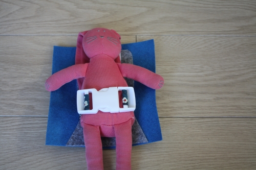 Pour la deuxième, j’ai tenté de dessiner moi-même la forme du siège d’avion. J’ai accessorisé avec un tetière en feutrine blanche. L’élément principal de cette page est l’attache sangle pour s’entrainer à l’ouvrir et la fermer et attacher doudou avant le décollage. Comme la page manquait un peu de couleurs, j’ai mis du ruban liberty comme ceinture de sécurité.