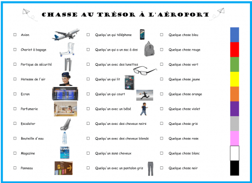 Non, il n’y aura pas de trésor caché dans le cockpit. Mais pour occuper mon aînée pendant les heures d’avion et d’attente à l’aéroport, j’ai préparé une liste de choses à trouver autour de soi.