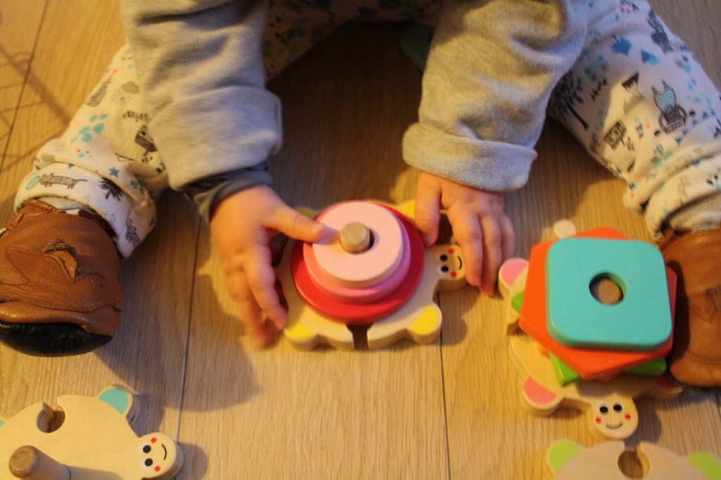 Quant au jeu Hape, il y a une difficulté supplémentaire puisque qu’il y a des boutons sur les tiges. Bébé doit donc faire tourner chaque pièce colorée pour empiler correctement en contournant les boutons. Les pièces bleues sont les plus faciles à insérer car il n’y a qu’un bouton sur la tige. Puis viennent les vertes, les jaunes et enfin les roses. Pour l’instant, je ne propose à la cadette que de jouer avec les deux plus faciles et je mets les pièces colorées juste à côté de la tige correspondante. Elle n’a pas encore bien compris qu’il fallait les faire tourner. Cela viendra.