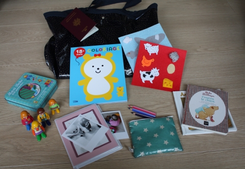 Il y a quelques jours, je vous ai montré le contenu du sac à dos de l’aînée (c’est ici), voici ce que j’ai prévu pour occuper la cadette (18 mois) qui voyagera, en alternance, sur les genoux de papa et maman.
