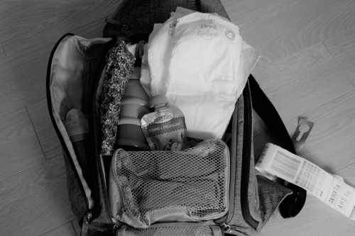 Nous avions donc avec nous une valise cabine car la cadette avait droit à 12 kg en cabine (et 10 kg en soute). Celle-ci contenait une tenue de rechange pour chacun et surtout les indispensables pour bébé comme le lait en poudre, quelques médicaments, un pyjama et une gigoteuse. Le reste des affaires pour la mini (18 mois au départ) était dans notre sac à langer, le Jule’s Bag de Papa, Maman et Moi. C’est un sac à langer pratique car portable en bandoulière ou sur le dos et de nombreuses poches (dont une isotherme) pour ranger chaque chose à sa place. Nous y avions rangé tout le nécessaire de change, une tenue de rechange, un porte-bébé sling, un lange, un bavoir, deux biberons, des dosettes de lait en poudre, une bouteille d’1 litre d’eau et quelques petits pots. Quant aux jouets pour occuper la cadette, ils étaient dans mon grand sac à main.