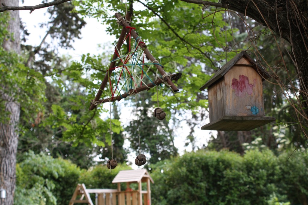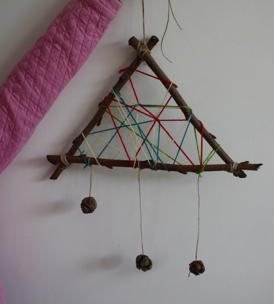 L’été dernier, nous avions visité le jardin de Saint-Martin (dans le Cantal) et nous avions trouvé plein de chouettes idées pour décorer notre jardin. Le printemps étant là et comme nous passons beaucoup de temps dans le jardin, nous repensons sa décoration. Pourquoi un attrape beau temps ? Parce que depuis 10 jours, il pleut quotidiennement. Pas longtemps, mais tous les jours. Alors, un peu comme l’attrape rêve éloigne les cauchemars, l’attrape beau temps éloignerait les orages (enfin, c’est à vérifier). Et pourquoi cette forme triangulaire ? Parce qu’après avoir cassé plusieurs branches en tentant de les plier en demi-cercle, j’ai opté pour la facilité.