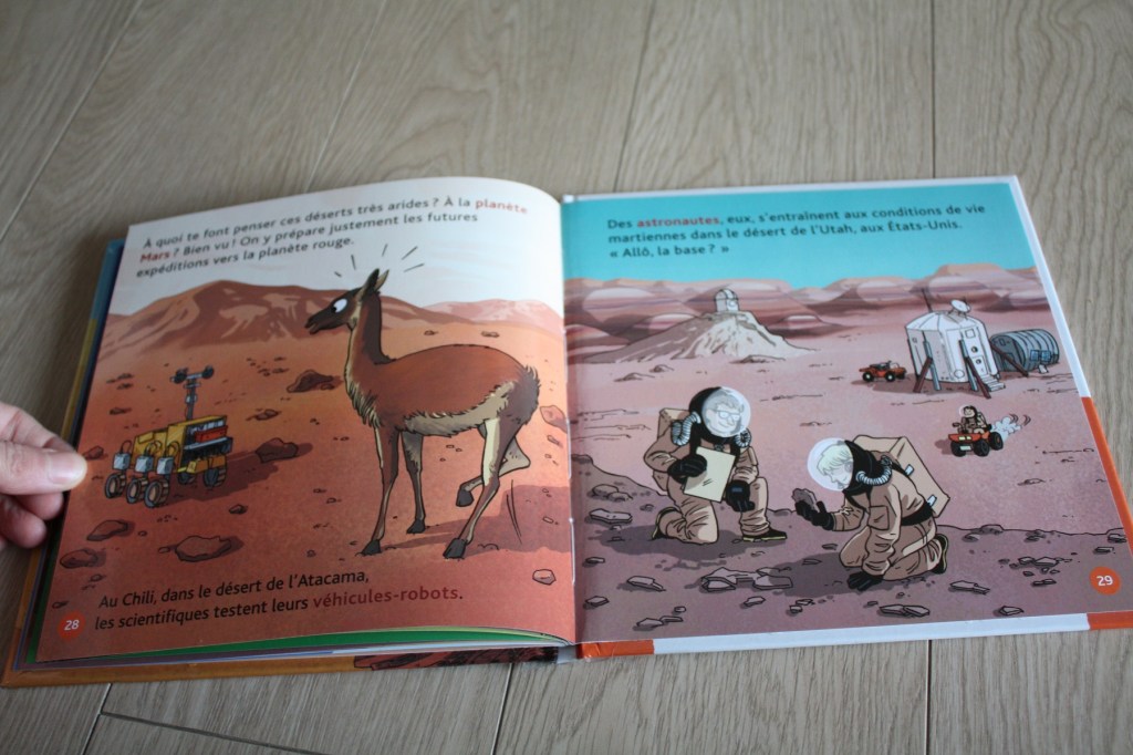 Nous avons plusieurs documentaires de cette collection. Je les trouve très bien pour les 3-6 ans. Ils y a beaucoup d’illustrations assez réalistes et les textes sont simples. Dans celui sur le désert sont abordés les différents types de désert, leurs principales caractéristiques, les animaux qui y habitent mais aussi les explorateurs qui décident de traverser des déserts ou les astronautes qui s’exercent dans le désert en attendant de découvrir la planète Mars.
