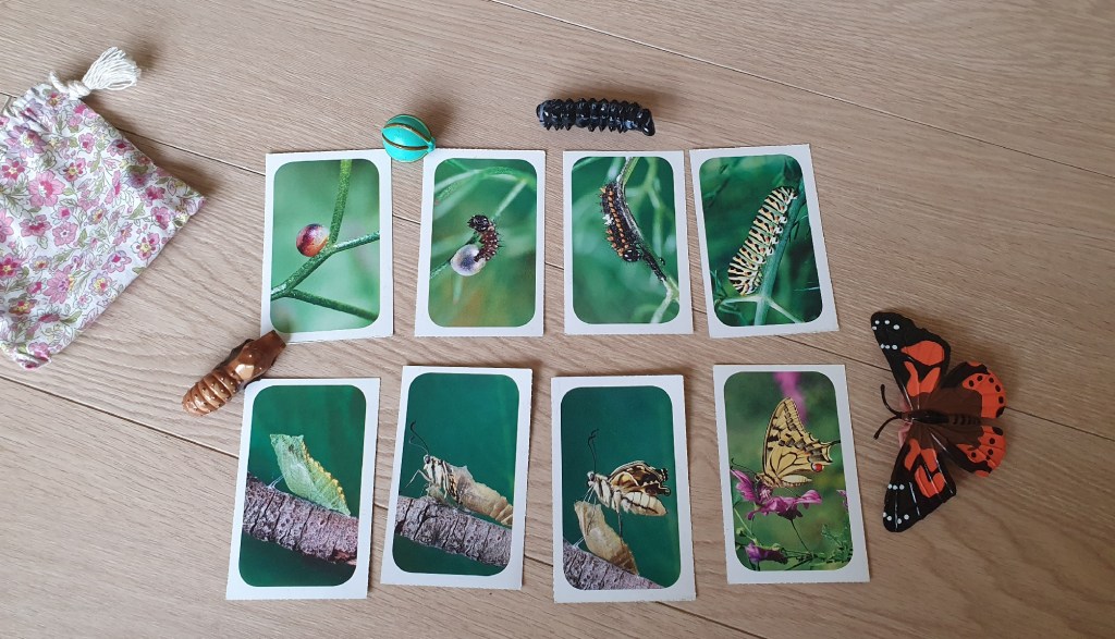 Maintenant que l’aînée maîtrise la lecture, elle a pu mettre les cartes et les légendes toute seule dans l’ordre. Et nous avons ressorti nos figurines Insect Lore représentant l’œuf, la chenille, la chrysalide et le papillon.