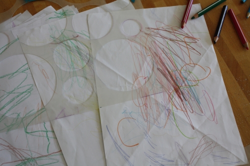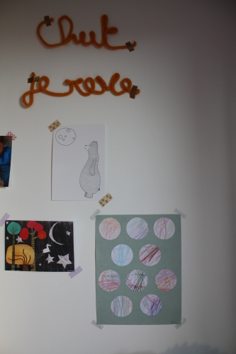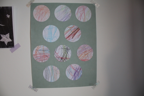 Alors j’ai décidé de sélectionner une petite partie de ces dessins du soir, un rond de la partie la plus coloré par exemple, parfois plusieurs ronds par feuille. J’ai collé ces dix ronds sur une feuille bleue et je l’ai affiché dans sa chambre.