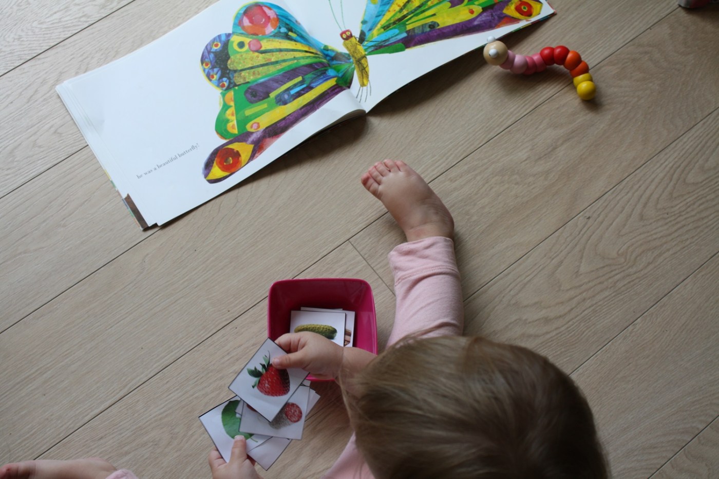 Comme nous avons joué avec la plus grande sur le cycle de vie du papillon, j’ai accompagné la lecture de ce livre par un jeu pour la cadette : des cartes avec les photos de tous les fruits et aliments mangés par la chenille. Le but étant de les remettre dans l’ordre de l’histoire (avec l’aide de sa sœur) et de les faire « grignoter » par notre chenille en bois.