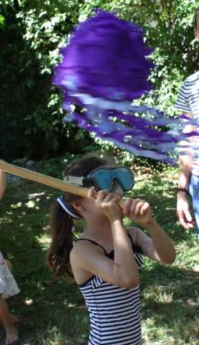 J’ai récidivé. J’ai fait une pinata en papier mâché, avec comme base un ballon gonflable et en utilisant des prospectus et de la colle fait maison à la farine. Le ballon s’est dégonflé avant que la pinata soit vraiment solide, du coup la forme était un peu biscornue. Mais avec le papier crépon, on reconnait bien une méduse, n’est-ce pas ? Plutôt que de mettre un bandeau sur les yeux des enfants pour taper sur la pinata, j’avais occulté avec un morceau de tissu un masque de plongée. Dedans étaient cachés des bonbons, sucettes et ballons.