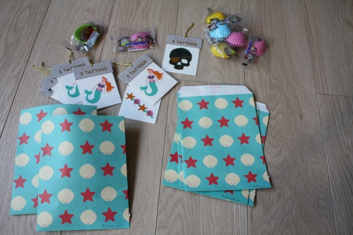 J’avais découpé pour chaque enfant dans du jersey à rayures des bandeaux pour mettre dans les cheveux ou façon pirate. Et dans un petit sac, nous avons offert des tatouages sirène ou pirate, un bonbon roudoudou (mais dans un faux coquillage) et partagé les trésors du coffre et de la pinata.