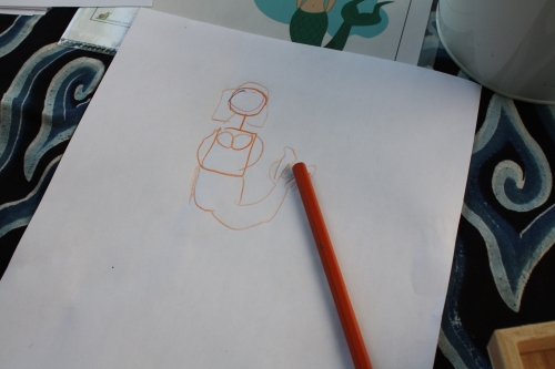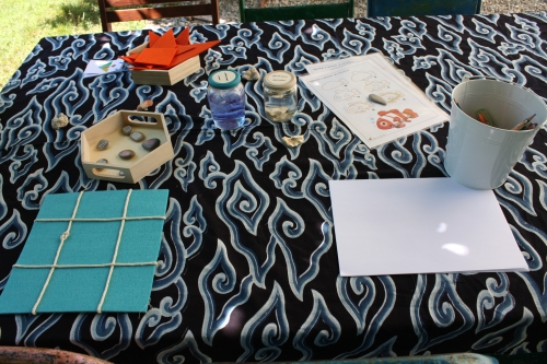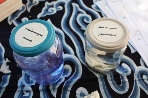 Sur une table, j’avais mis à disposition quelques jeux comme un jeu de morpion (présenté ici) et de tangram (présenté par là). Il y avait aussi des feuilles, des crayons de couleurs et des pas à pas pour dessiner un dauphin, une sirène ou un poisson (trouvés sur ce site). Et pour décorer un peu, j’avais préparé deux bocaux, façon cabinet de curiosité, avec une vraie-fausse dent de requin (soit un caillou) et une méduse (dont j’ai trouvé le tuto sur ce livre).