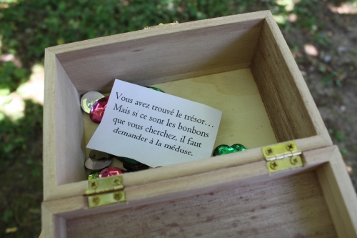 Vous avez trouvé ? Dès qu’ils devinaient, ils partaient à la recherche de la bouteille suivante, avant de chercher le coffre aux trésors qui contenaient des faux brillants (qui ont beaucoup plu aux filles).