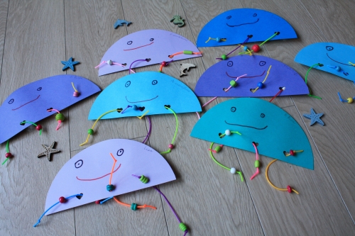 Pieuvre ou méduse, avec du papier épais coloré, des scoubidous, quelques perles et une perforatrice, j’ai créé les cartes d’invitation. Ma fille leur a fait des yeux et une bouche. Au dos, j’ai collé un morceau de papier avec le message et les coordonnées.