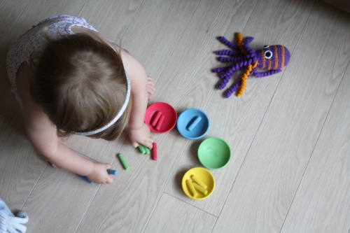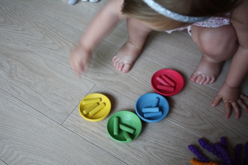 Et là, j’ai découvert que si je lui disais le nom d’une couleur (parmi ces quatre bien sûr, elle ne connaît pas encore lie de vin ou taupe), elle savait me montrer le bol correspondant. Alors, nous lisons souvent des livres sur les couleurs, je vous en parle bientôt d’ailleurs. Peut-être a t-elle appris de cette manière ou peut-être à la crèche…