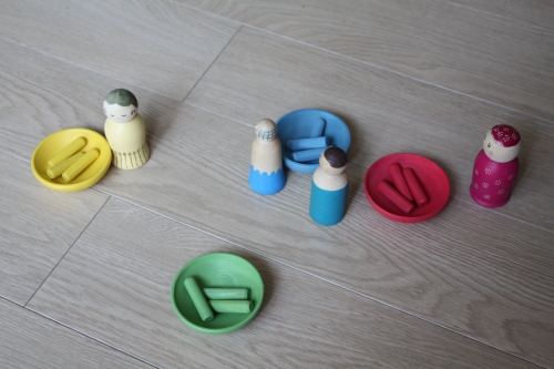 J’avais proposé il y a quelques temps à la cadette de trier des objets de la maison par couleur. Elle avait préféré les trier par type comme la petite voiture rouge avec la petite voiture jaune… Alors j’ai pensé qu’il fallait faire plus simple pour débuter à se familiariser avec les couleurs. J’ai trouvé quatre bols en bois brut ; j’ai acheté, dans un magasin de bricolage, des bitoniaux en bois (ceux que l’on utilise pour monter les meubles suédois) et de la peinture acrylique (les testeurs de peinture écologique ont ma préférence).