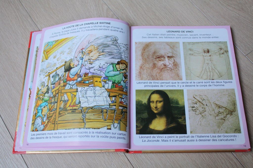C’est un documentaire pour enfants d’une centaine de pages très complet puisqu’il parle d’art au sens large. De peinture et sculpture bien sûr, mais aussi de musique, danse, cinéma, photographie, architecture et théâtre. Et pour chaque domaine, le livre présente l’évolution de l’art au fil du temps, mais aussi dans les différents continents.