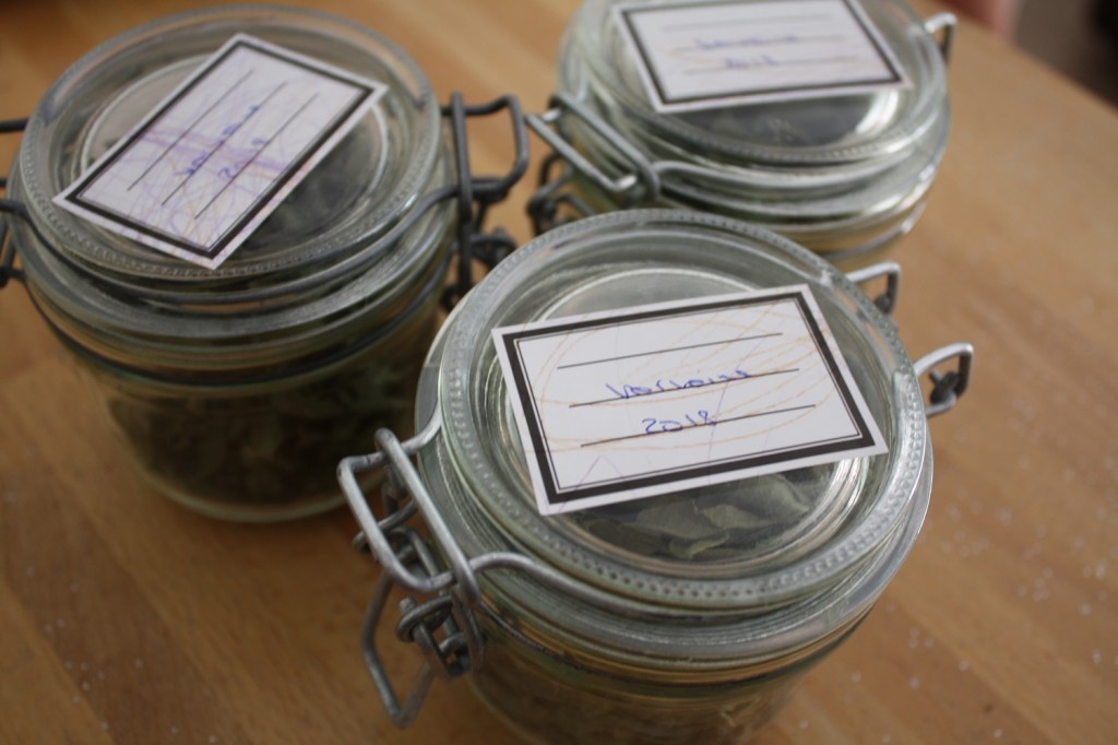 Elle a rempli deux petits pots en prenant soin de garder les feuilles entières mais sans morceaux de branches. Ensuite, je lui ai proposé de décorer les étiquettes à coller sur les pots. Et voilà !