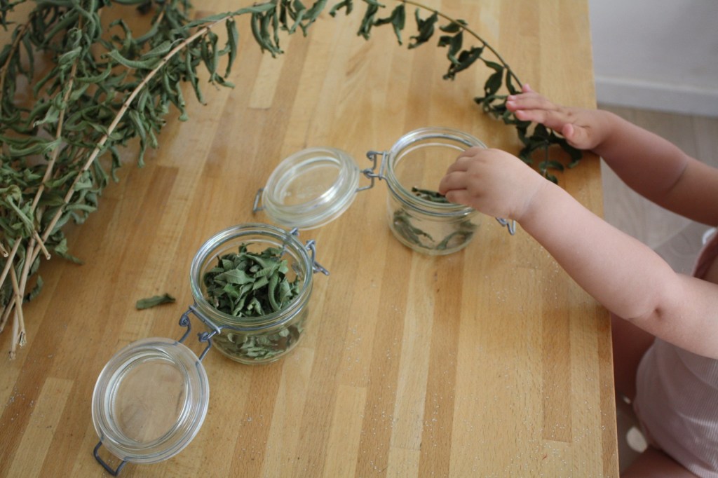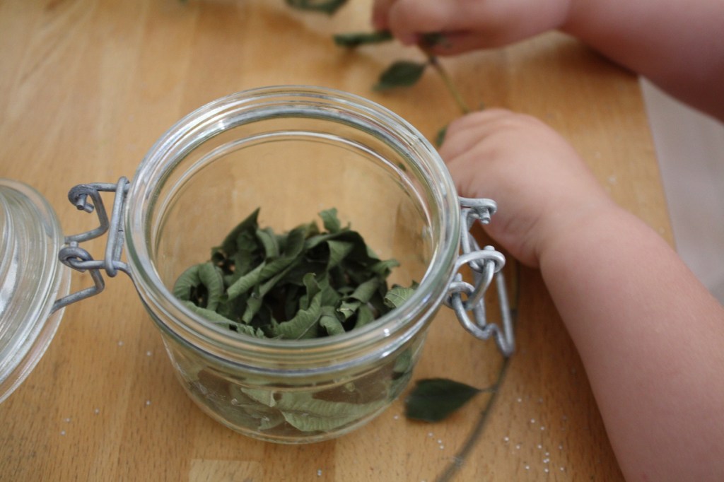 Cette fois-ci, j’ai proposé à la cadette de s’en charger toute seule, c’est-à-dire de récupérer les feuilles de verveine sur les branches séchées et de les mettre en pot.