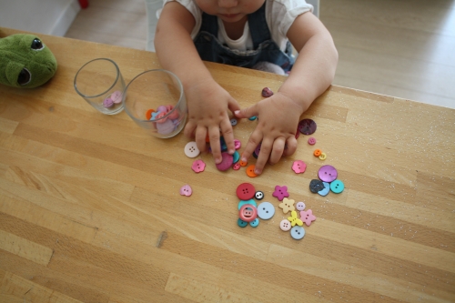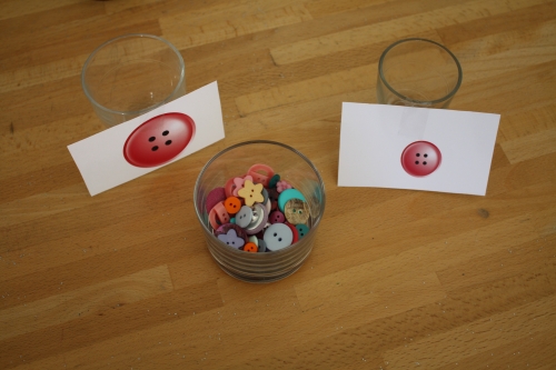 Nous avons une livre de la collection Petit poisson blanc que je trouve bien pour présenter les contraires comme petit et grand, propre et sale, content et triste… Et puis, nous avons fait un jeu tout simple avec des objets du quotidien soit deux verres de taille différente et un stock de boutons. Il fallait trier et mettre les grands boutons dans le grand verre, les petits boutons dans le petit verre.