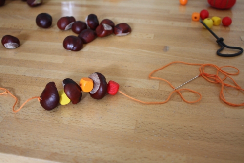 Ma fille aînée a fait des trous dans les marrons avec une vrille à bois. Puis, elle a créé une guirlande avec du fil à broder en alternant marron et perle en bois aux couleurs automnales.