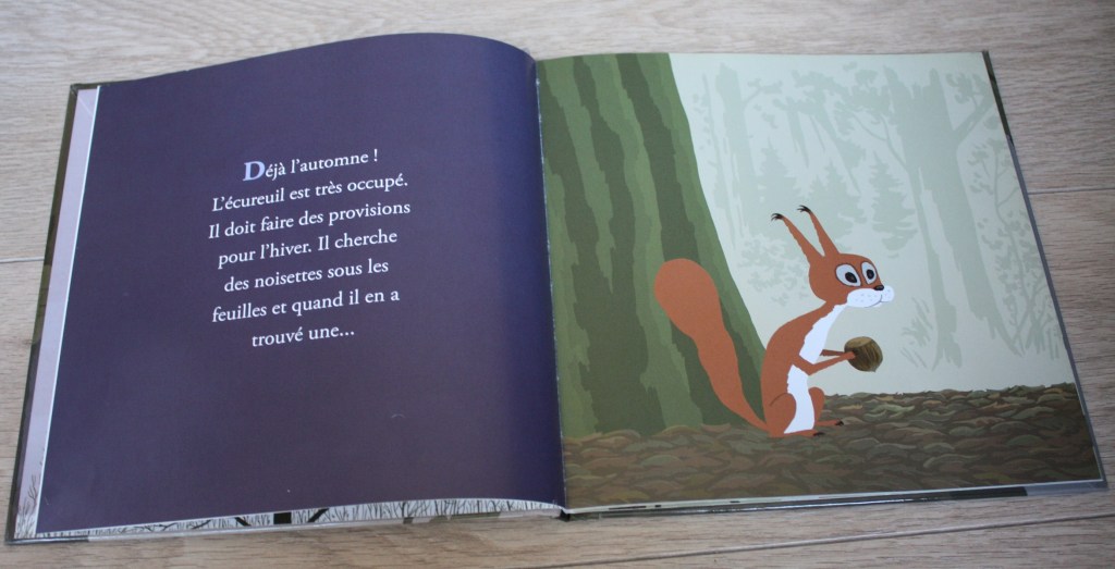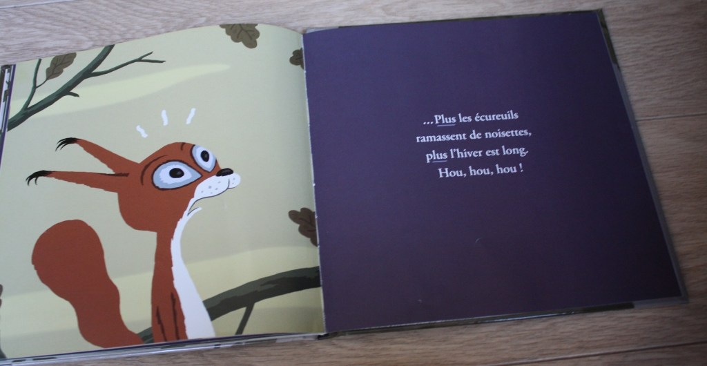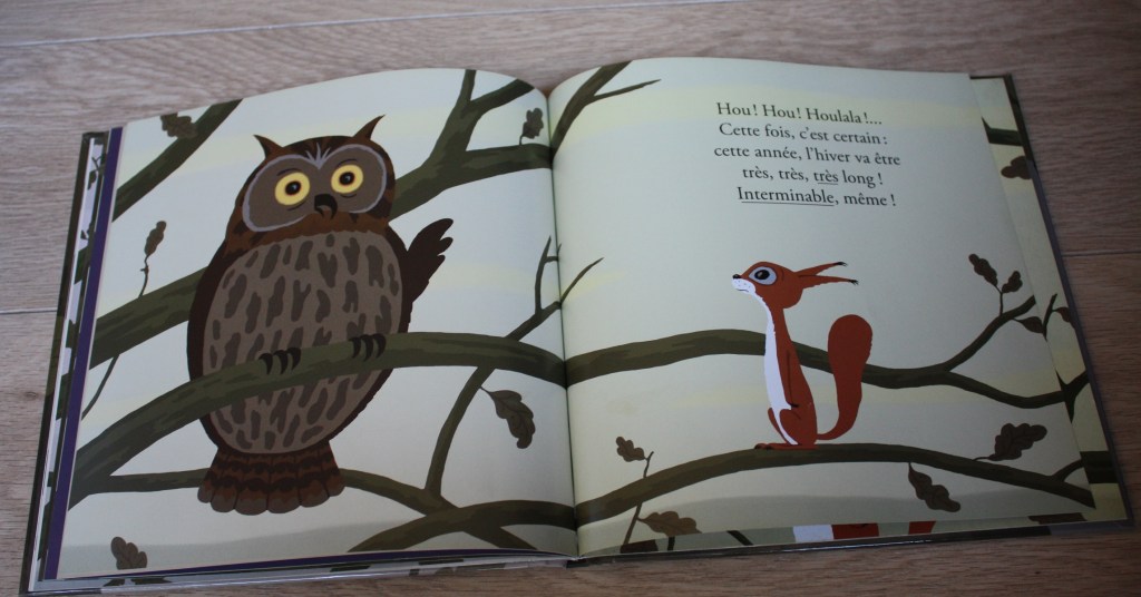 Donc, comme je le disais, un écureuil prépare l’hiver en faisant des provisions de noisettes. il a déjà fait un petit stock, mais comment savoir ce qu’il lui faudra et combien de temps durera l’hiver. Il va voir son voisin le hibou pour essayer d’en savoir plus. Comme le hibou lui annonce que l’hiver sera long, l’écureuil amasse encore plus de noisettes et retourne voir le hibou pour être vraiment sûr. Le hibou lui annonce maintenant que l’hiver sera interminable. Mais comment le sait-il ? Vous voulez savoir ? Si vous préférez la surprise de la chute, ne regardez pas la dernière image 😉