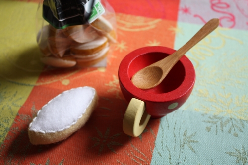 Connaissez-vous le calisson, cette friandise aixoise à base d’amande et de melon confit ? Certains accompagnent leur café d’un carré de chocolat ou speculoos, ici c’est le calisson. Les filles adorent aussi. Du coup, j’aimais l’idée d’en avoir des faux pour jouer à la dinette. Bien sûr, je n’ai jamais vu de calisson pour dinette en boutique en quelque matière que ce soit (comme c’était le cas pour le gâteau des rois), alors j’ai décidé d’en coudre. J’avais la feutrine de la bonne couleur depuis longtemps, mais c’est ce week-end que je me suis enfin lancée. J’ai fait deux prototypes, voici le préféré.