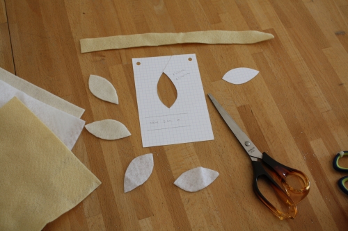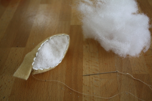 J’ai dessiné un sorte de losange à main levée (pas trop moche) dans du papier épais pour le gabarit. J’ai découpé un losange dans de la feutrine blanche (pour le dessus en glace royale), un autre dans de la feutrine blanc cassé (pour l’hostie). J’ai coupé une bande de feutrine beige de 2 x 15 cm (pour l’intérieur du calisson). J’ai cousu le losange du dessus avec la bande, puis le losange du dessous en laissant une ouverture pour rembourrage. Puis, j’ai fait une couture décorative au fil à broder blanc sur le dessus du calisson. Enfin, j’ai fermé le calisson.