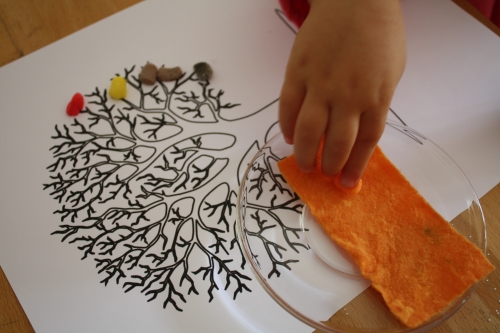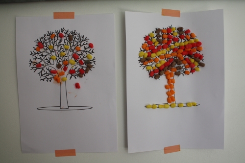 Pour décorer le mur au dessus de la table de saison, j’ai proposé, d’abord, à la cadette (2 ans) de décorer un arbre aux couleurs de l’automne. J’ai trouvé un coloriage d’un arbre avec tronc et branches et je lui ai fait découvrir les playmais. Ce sont des petits flocons naturels à base de maïs qui se collent entre eux ou à une feuille en les humidifiant légèrement. J’ai sélectionné les couleurs rappelant les feuilles d’automne comme le jaune, orange, rouge et marron.