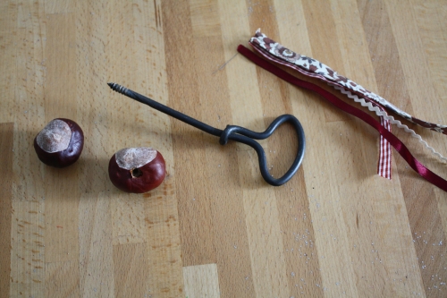 Comme nous avons trouvé beaucoup de marrons, j’ai suivi le tutoriel du magazine pour créer des comètes de marron pour jouer à les lancer dans le jardin. J’ai juste remplacé les bandes de papier crépon par de jolis rubans.