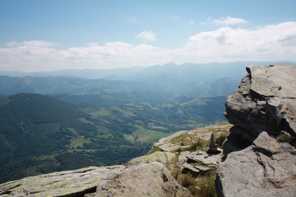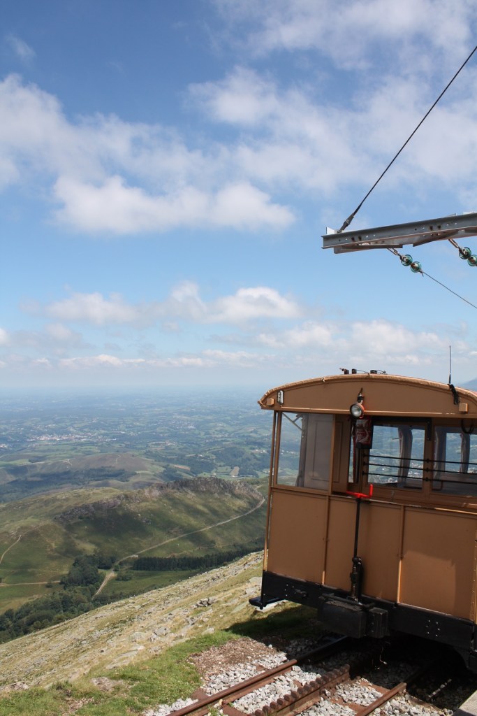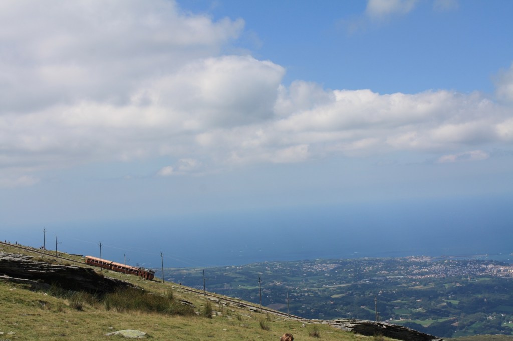 Nos vacances d’été se sont déroulées entre Pays Basque espagnol et Pays Basque français, et cette balade à la Rhune en est une bonne conclusion. Pile à la frontière entre les deux pays et en hauteur pour admirer le paysage des deux côtés. La Rhune est une petite montagne qui culmine à 900 mètres d’altitude. Mais nul besoin de faire des kilomètres qui usent les souliers pour en atteindre le sommet. Quoique, les randonneurs peuvent la gravir en un peu plus de deux heures. Mais avec des enfants jeunes, il y a le train. Un train à crémaillère datant de 1924, avec des wagons d’époque. C’est donc le moyen que nous avons choisi pour admirer la vue sur le Pays Basque. Trente-cinq minutes de montée dans la verdure, en observant des pottoks, ces poneys originaires de la région.
