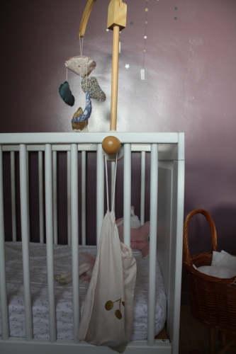 Depuis plusieurs mois, en plus de l’histoire du soir, la comptine est devenue un rituel du coucher. Nous avons parfois l’impression de chanter toujours les mêmes chansons. Alors, j’ai préparé un sac à comptines pour qu’une main innocente choisisse la comptine du soir. Mais qu’il y a t-il dans ce sac (un pochon à vêtements reconverti) ?