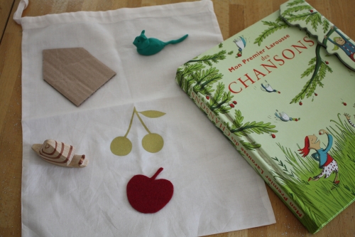 Il y a des petits objets, dessins, modelages représentant un élément clé d’une comptine. Un dessin de loup décalqué par l’aînée pour Promenons-nous dans les bois, une souris verte en pâte auto-durcissante (toute la famille est unanime pour dire que cela ressemble à un chat… sauf moi 🙂 pour Une souris verte, un morceau de carton découpé en forme de maison pour Pirouette, Cacahuète, une forme de pomme en feutrine pour Pomme de reinette…