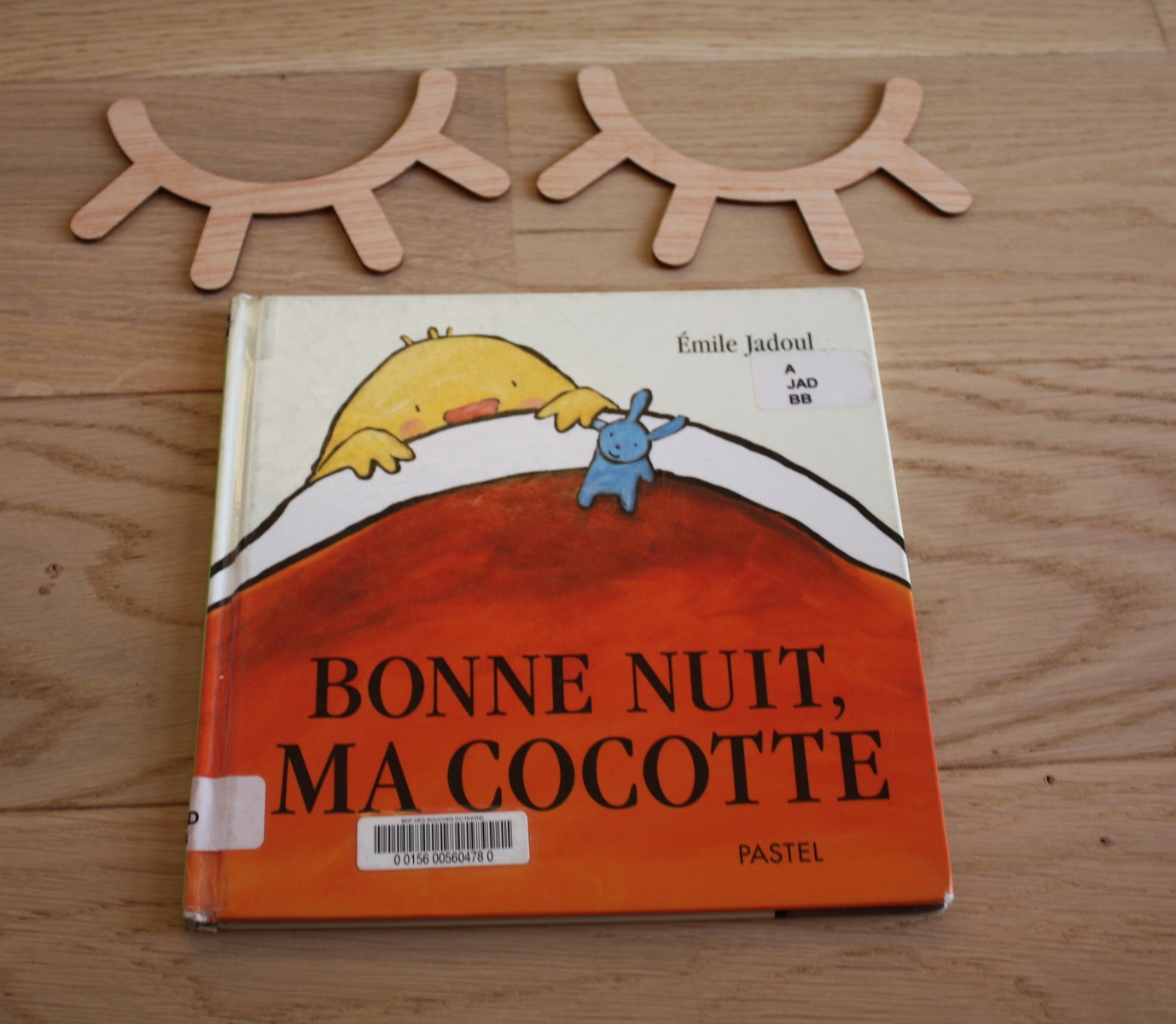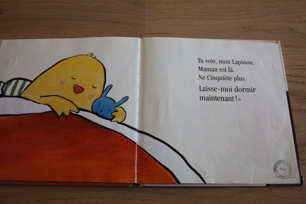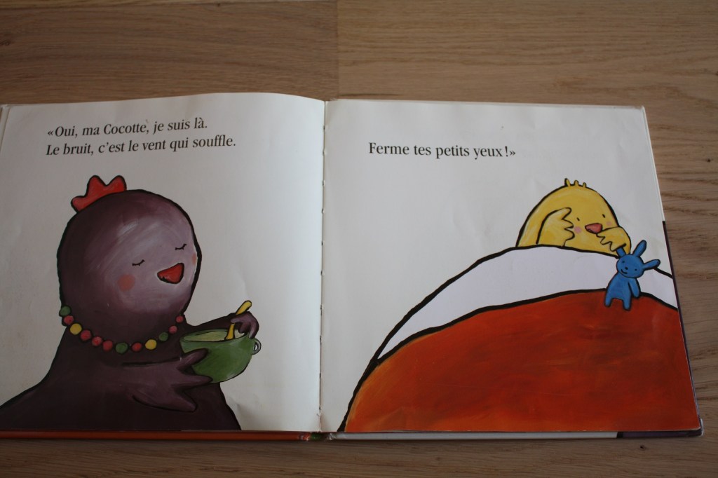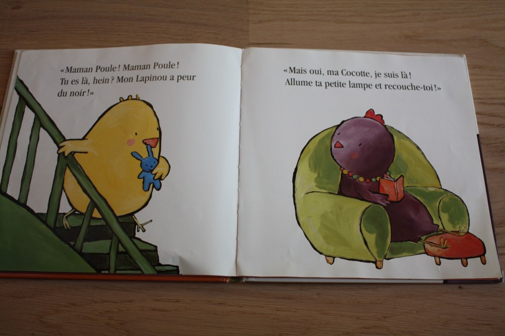 Quoi de mieux comme histoire du soir qu’une histoire qui parle du coucher et du sommeil. D’ailleurs cela fait plusieurs jours que c’est le choix de la cadette avant de dormir. Cocotte est une petite poule (un poussin donc) qui a un peu de mal à s’endormir. Mais ce n’est pas elle, c’est son lapinou (un doudou donc) qui a peur du bruit, peur du noir, envie de faire pipi et surtout peur que maman ne soit plus là. La maman bienveillante rassure sa cocotte.
