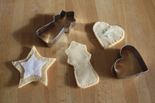 Pour la pompe à l’huile (la recette de la vraie est ici), j’ai cousu une grande galette en feutrine marron, rembourrée, et j’ai représenté les incisions avec du fil à broder. Pour les sablés, j’ai utilisé les emporte-pièces pour découper deux la fois la forme dans de la feutrine beige. J’ai ajouté un peu de glaçage en feutrine blanche ou des perles telles du sucre décoratif.