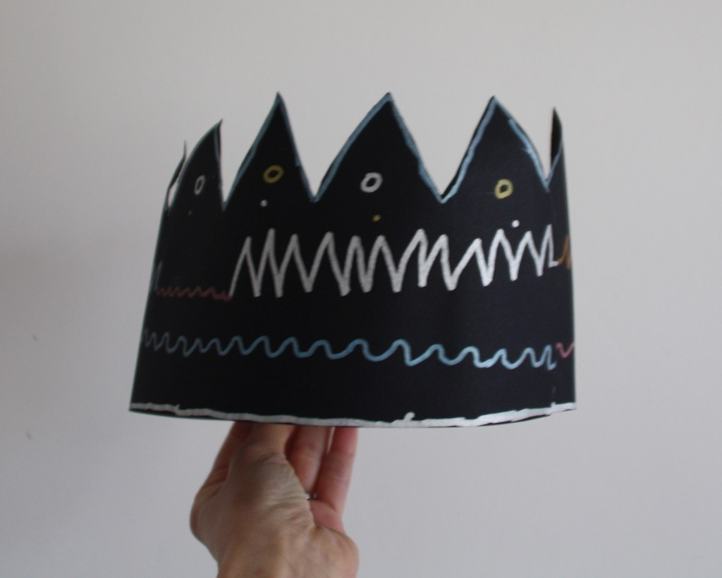 Pendant ce temps, l’ainée a fait une couronne en papier. Choix du papier, dessin de la couronne, découpage et décoration aux feutres métalliques. Elle a tout fait seule et est fière du résultat.
