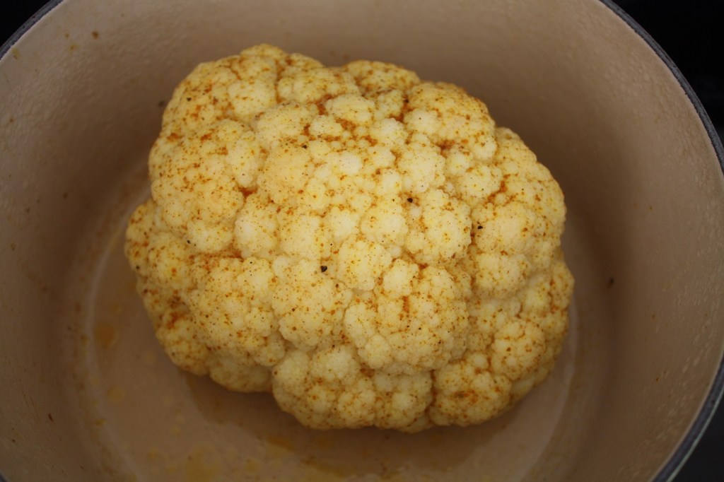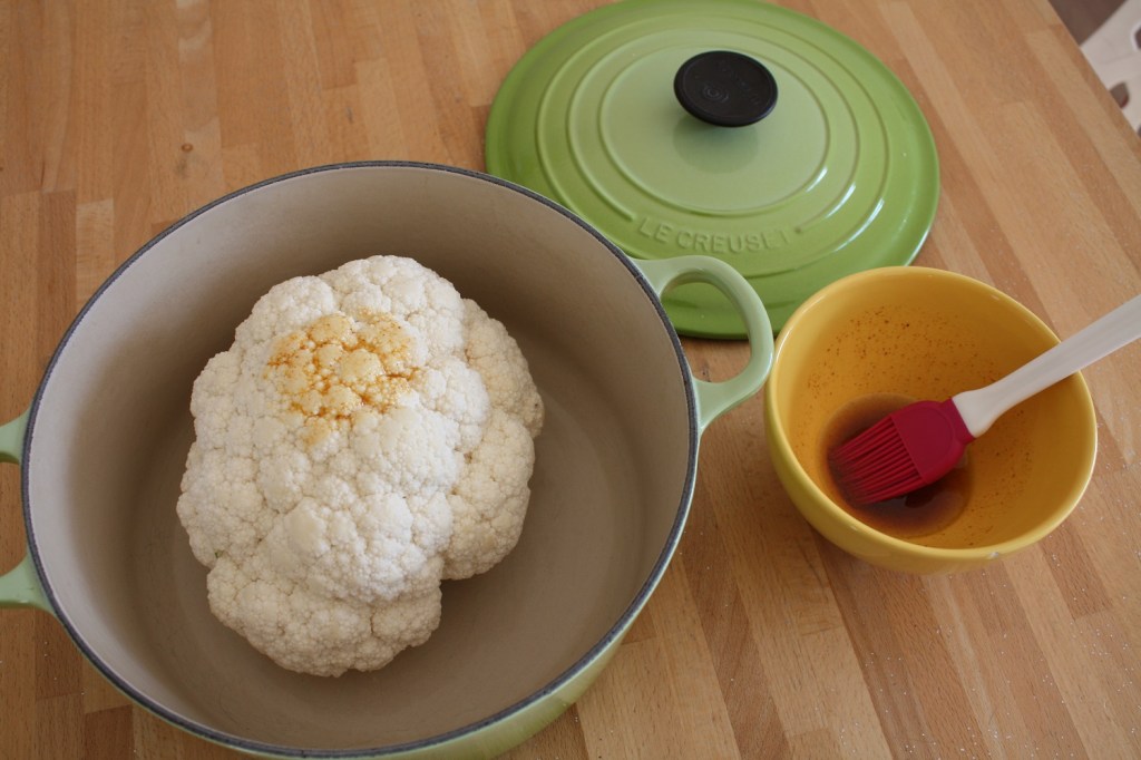 Faites préchauffer le four à 180°C (thermostat 6). Retirez les feuilles et le trognon du chou-fleur. Lavez, séchez et mettez le chou-fleur dans une cocotte en fonte. Dans un bol, mélangez l’huile, les épices, le sel et le poivre. A l’aide d’un pinceau, badigeonnez le chou-fleur. Ajoutez un verre d’eau au fond de la cocotte. Et voilà, il n’y a plus qu’à mettre au four pour 45 minutes environ.