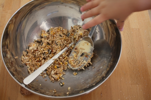Et comme mangeoire, nous avons décidé de fixer une panière à pain dans le petit prunier, le plus visible de la baie vitrée. La grande a cassé les noix et ouvert les cacahuètes (non grillées et non salées !) et la petite a mélangé les graines à la margarine pour former des boules de graines.