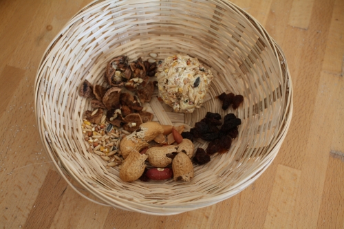Les petits oiseaux visitant notre jardin sont des rouges-gorges et des mésanges (après observation, ce sont plus précisément des mésanges bleues). J’ai donc recherché qu’elle était leur alimentation. Puis, hier nous avons aperçu un chardonneret élégant ; je dois donc me renseigner. Les deux premiers oiseaux mangent insectes l’été et graines l’hiver. J’ai donc rassemblé un sac de graines (dont la composition n’est pas renseignée, dommage), noix, cacahuètes, raisins secs, pépins de pomme et margarine. J’ai lu quelques part que les mésanges aimaient les pépins de pomme, nous avons donc mangé compotes et clafouti pour en récupérer.