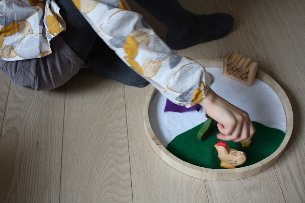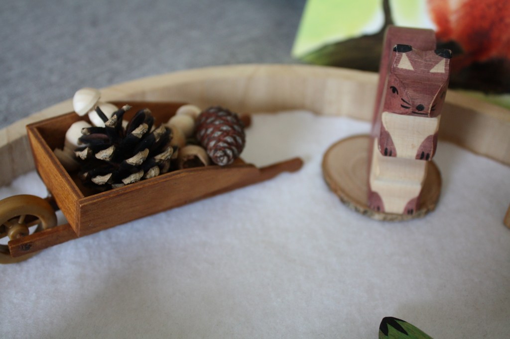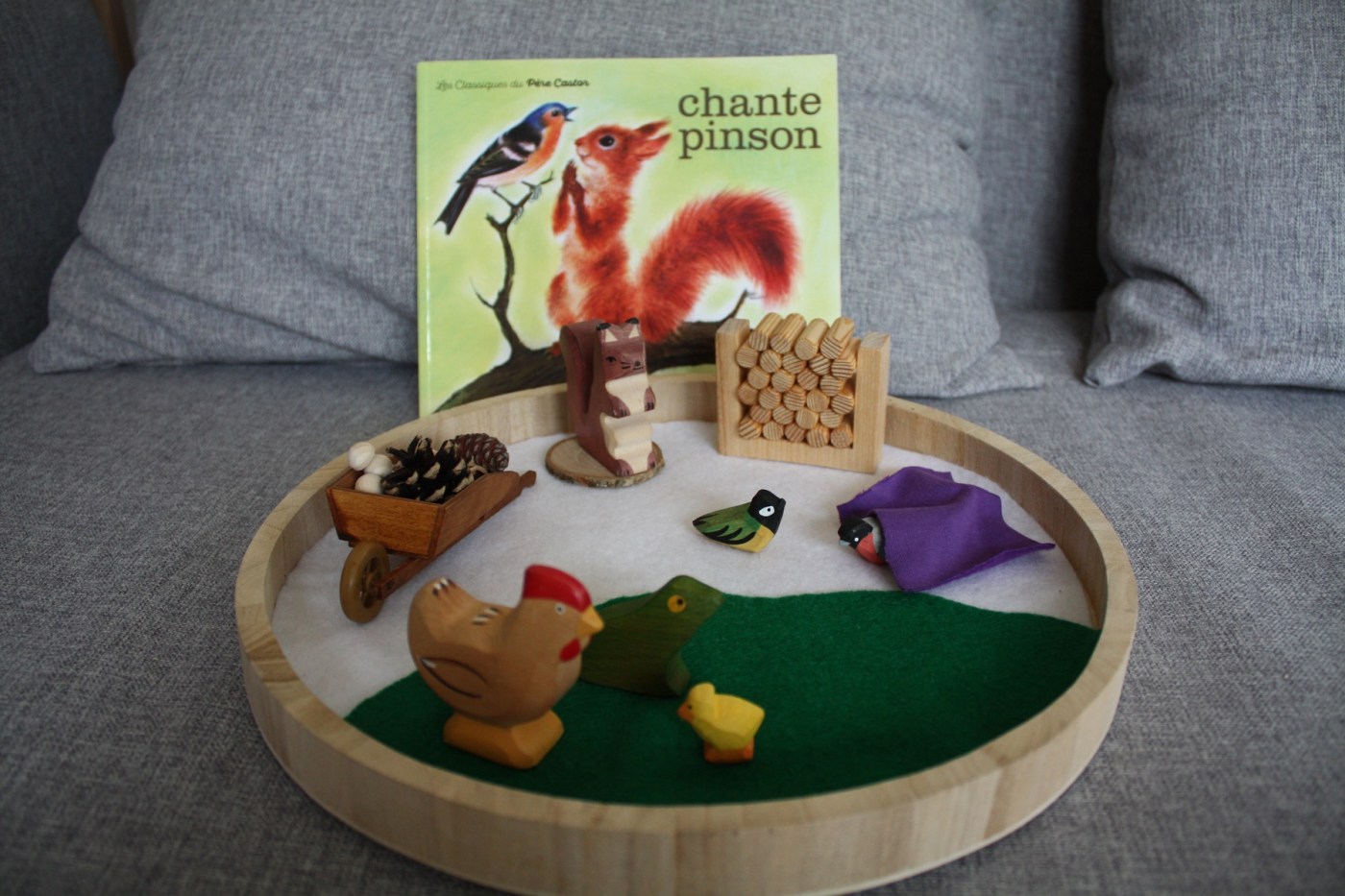 Et pour prolonger l’histoire, j’ai proposé aux filles de rejouer l’hiver de l’écureuil et le pinson avec leurs jouets en bois, quelques éléments naturels et un décor en feutrine.