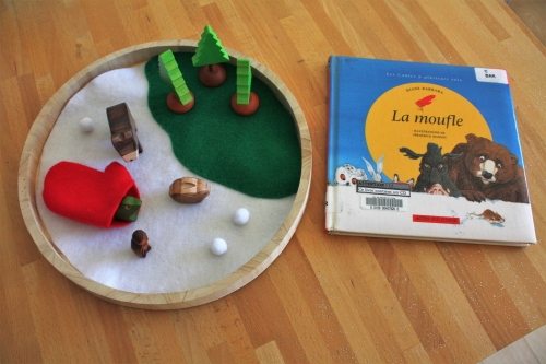 Et pour rejouer l’histoire, j’ai cousu une moufle en feutrine, ressorti le décor d’hiver et nos animaux en bois.