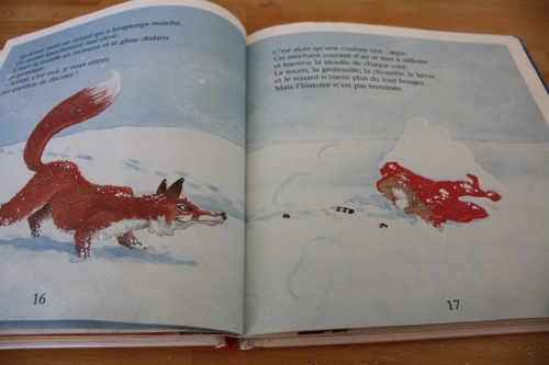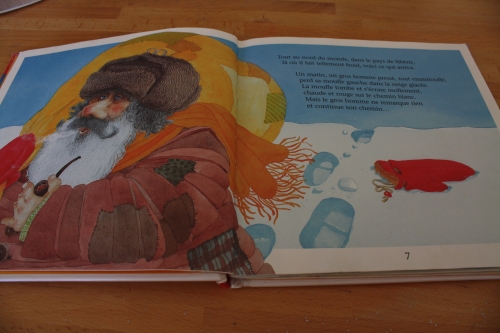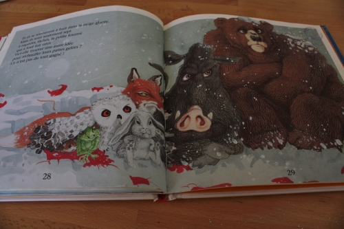 C’est un conte russe, un grand classique avec ses maintes versions. Mais nous ne l’avions jamais lu avoir d’emprunter ce livre de Diane Barbara et Frédéric Mansot aux éditions Acte Sud Junior. Une moufle est abandonnée dans la neige, tour à tour les animaux rentrent dedans s’y réchauffer. La grenouille, la souris, la chouette, le lièvre, le renard, le sanglier et même l’ours. Mais quand la petite fourmi s’y glisse, c’en est trop et la moufle explose. Une jolie histoire de solidarité et de partage.