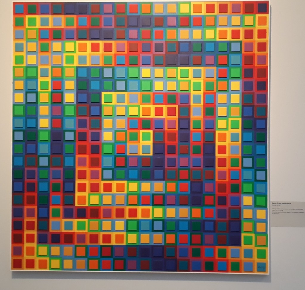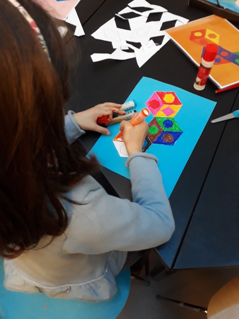 Nous avons fait une visite guidée de trois nouvelles salles à l’étage de la fondation : Vasarely plasticien. 250 œuvres et documents qui retracent le travail de Victor Vasarely de ses débuts en tant que graphiste à la conception de ses œuvres monumentales. La visite s’est poursuivie avec une jeu de piste : des morceaux de tableaux à retrouver, des œuvres à repositionner sur le plan des salles… Puis, l’aînée a fait un atelier sur le thème des illusions optiques de cubes : découpage, collage et coloriage inspirée de l’œuvre de l’artiste.