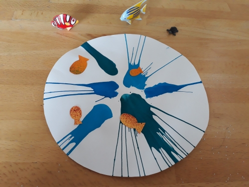 Tandis que de drôles de poissons se fixent discrètement (ou pas) dans les dos de la famille ou des amis, nos poissons nagent dans leur aquarium. Cela faisait très longtemps que je n’avais pas participé au rendez-vous L’art est un jeu d’enfant, et pour cette reprise c’est la cadette (2 ans et demi) qui vous propose une peinture avec deux accessoires originaux.