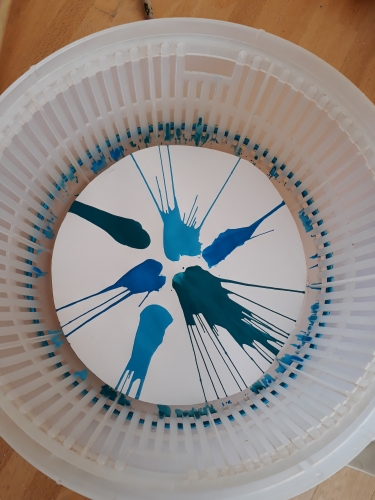 J’ai commencé par découper un rond de papier blanc de la taille du panier à salade. Nous avons sélectionné  trois nuances de gouache liquide bleu à mettre au centre du rond. Et puis, ma fille s’est amusée a faire tourner le papier dans l’essoreuse à salade pour étaler la peinture. Gros succès ! Voilà notre bocal était fait.