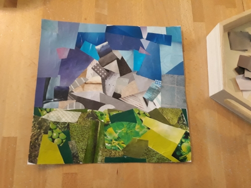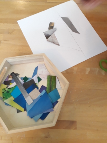 Après nos balades et pique-niques récents à la Sainte Victoire, j’ai trouvé sympa de représenter cette montagne symbole du pays d’Aix. L’artiste Paul Cézanne l’a peinte maintes et maintes fois. Nous ne pouvions pas tenter la copie. Alors, nous avons fait plus contemporain avec des collages. Des morceaux géométriques découpés dans les magazines et prospectus à recycler. Des nuances de vert pour la nature, gris pour la montagne et bleu pour le ciel. Au préalable, ma fille aînée a juste tracé le contour de la Sainte Victoire et l’emplacement du ciel.