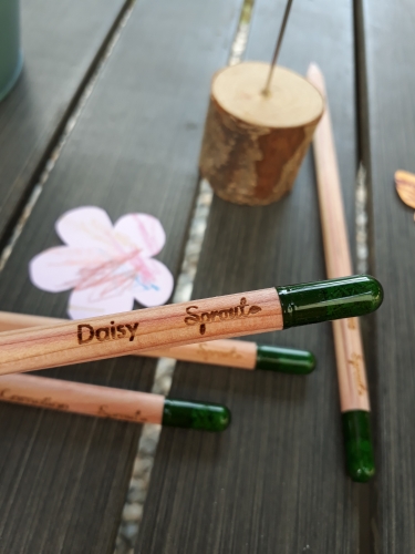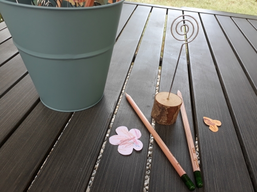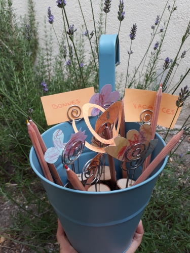 J’ai donc encore opté pour un cadeau à partager et en partie fait maison (à quatre mains). Nous avons créé un petit pot de fleurs fait de crayons à papier et de couleurs et de porte-photos. Les crayons sont à planter. Ils intègrent des graines de fleurs ou plantes aromatiques et lorsqu’ils sont trop petits pour écrire, il suffit de les planter dans la terre. J’y ai mis aussi des porte-photos faits de rondelles de bois et de tiges métalliques (achetés, pas fabriqués). Et nous y avons fixé des fleurs en papier. J’ai découpé la forme et ma fille cadette les a décorées. Voilà notre drôle composition florale. A la crèche, les puéricultrices et éducatrices pourront chacune prendre un crayon, un porte-photo, les deux ou choisir le pot en métal.
