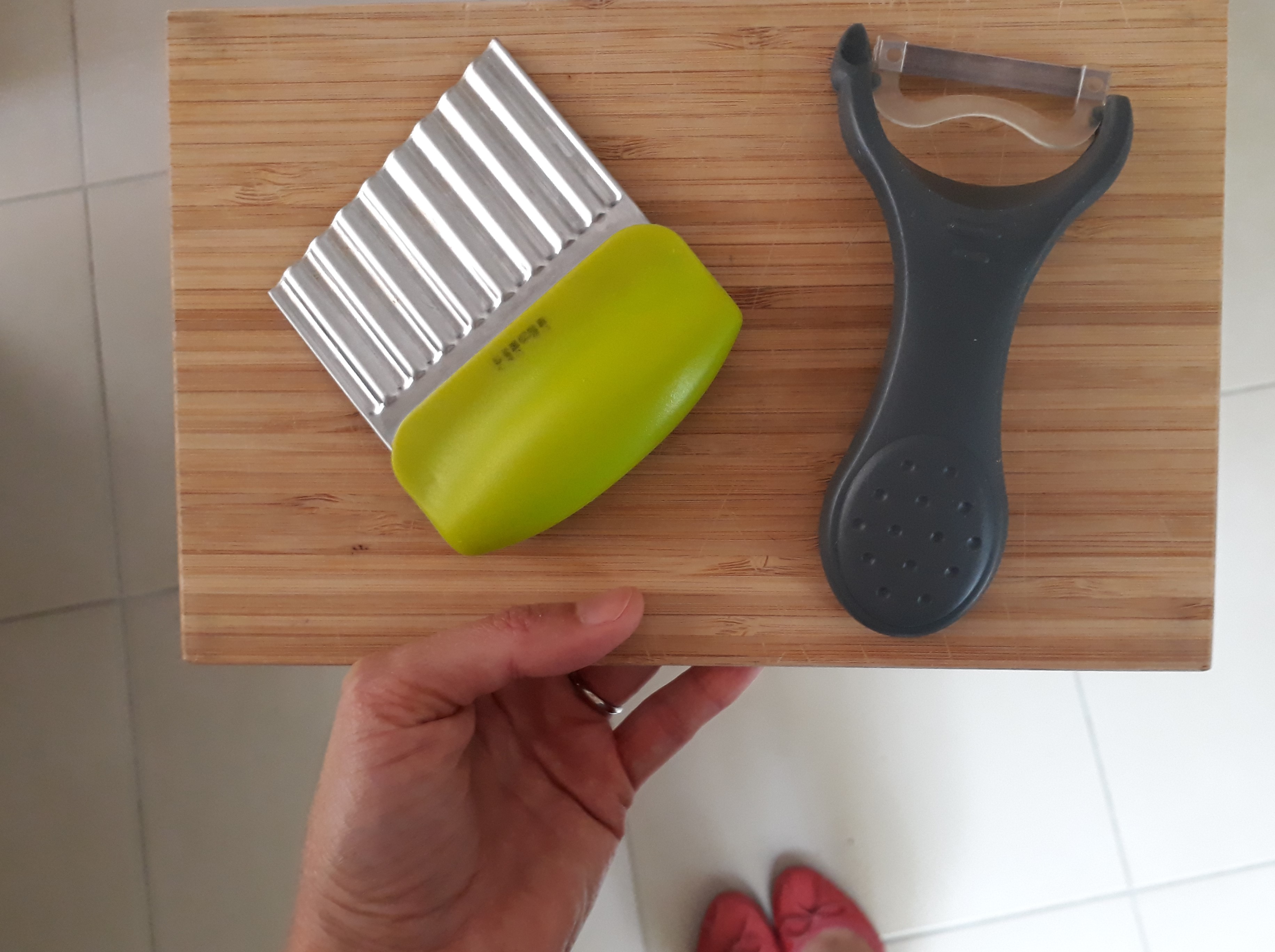 Si vous suivez le blog depuis quelques temps, vous avez déjà aperçu notre couteau à lame ondulée que les filles utilisent pour couper fruits et légumes (ici et là). Lorsqu’elles mangent une pomme ou une poire, elles ont l’habitude de la découper seules et d’ailleurs elles réclament leur couteau. Depuis peu, j’ai trouvé un éplucheur facile à utiliser pour les petites mains.