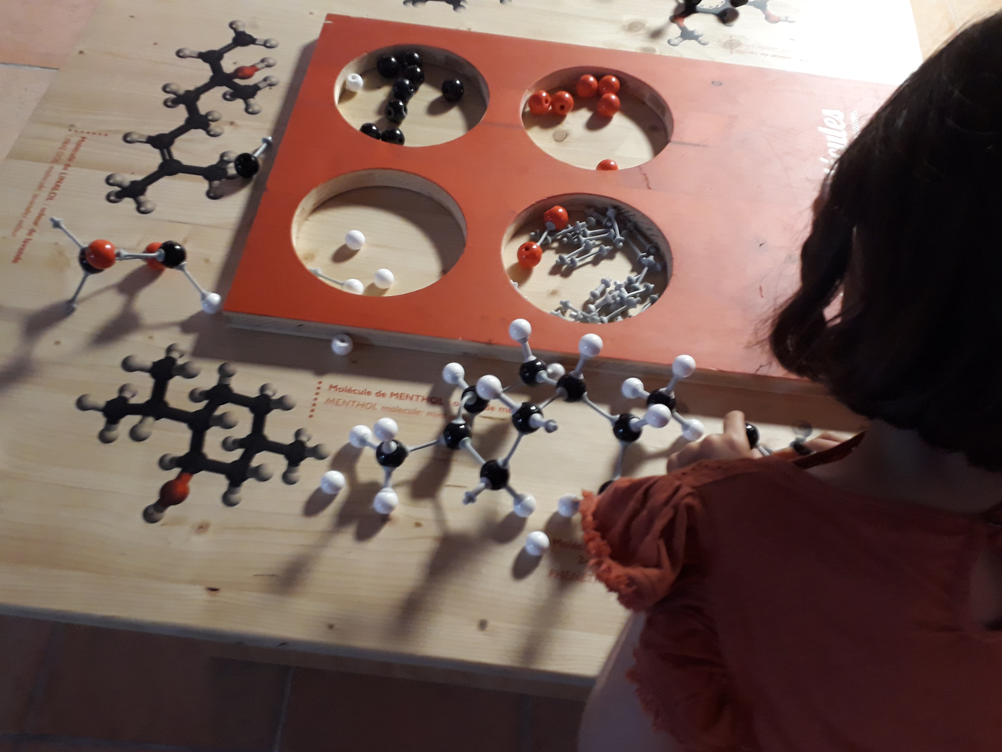 En plus des panneaux explicatifs, il y avait des films à visionner, des odeurs à sentir, des tiroirs à ouvrir… pour découvrir des plantes utilisées pour l’herboristerie, les huiles essentielles, dans la préparation de boissons ou de cosmétiques. C’était assez interactif. Des feuilles et un crayon ont été fournis aux filles pour décalquer, tamponner, embosser… des dessins de plantes.