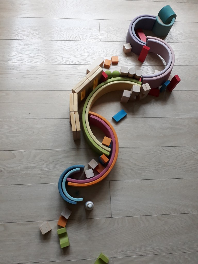 Les cubes et blocs en bois sont un des premiers cadeaux que les filles ont eus. Mais très honnêtement, c’était pour moi, à ce moment-là, un jeu dédié aux bébés, faisant et défaisant des tours et autres constructions instables. Aujourd’hui, j’ai une autre vision.